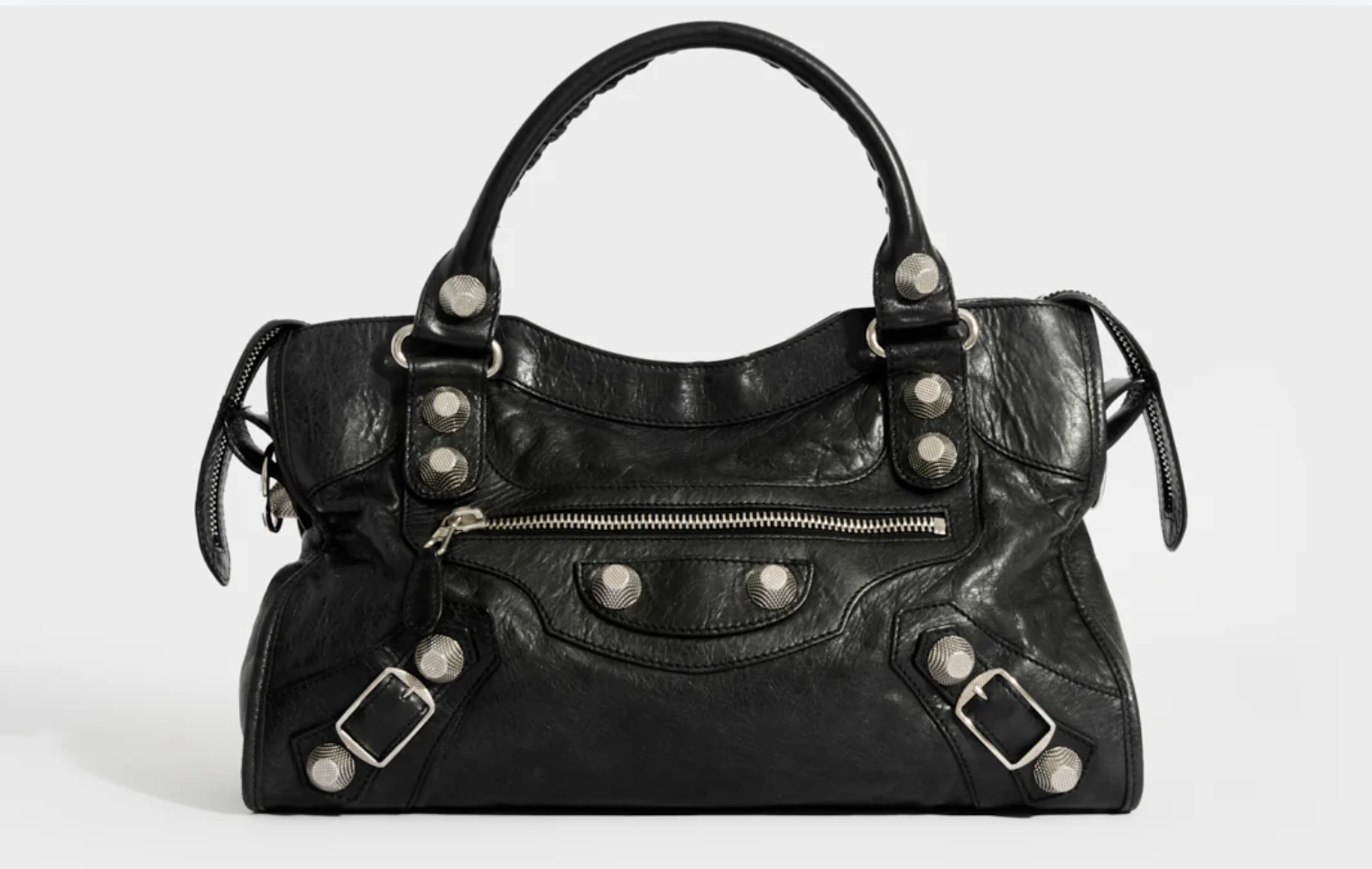 A close up shot of the black BALENCIAGA City Bag showcasing its edgy silver hardware soft leather texture and spacious design This bag is the epitome of laid back luxury perfect for those who want to combine practicality with high fashion Its slouchy silhouette and distinctive aesthetic make it a must have for any modern wardrobe